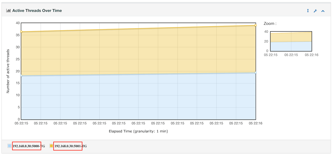 The numbers that appear to the left of the green box are the number of active threads / total number of threads,