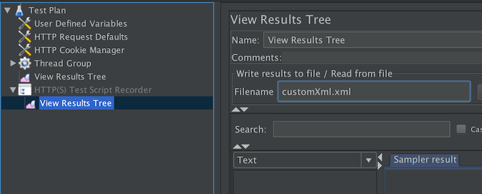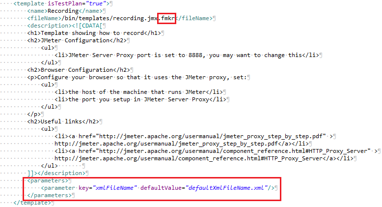 To do so we will use the parameters tag to tell JMeter to ask the user about a name for the concerned file :