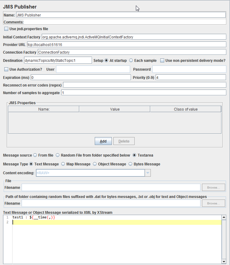 | Note: Setup at startup mean that JMeter starting connection with the Destination at beginning of test without name change possibility.