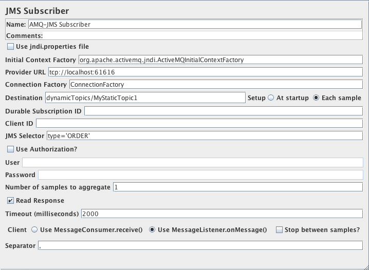 | Note: Setup at startup mean that JMeter starting to listen on the Destination at beginning of test without name change possibility.