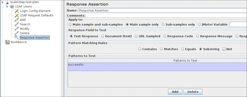 - Click on Add button and add the string "successful" in Pattern to Test field