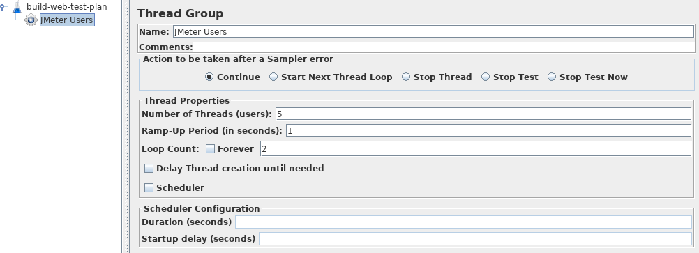 value to 0, then JMeter will immediately start all of your users. Finally, clear the checkbox labeled "Forever", and enter a value of 2 in