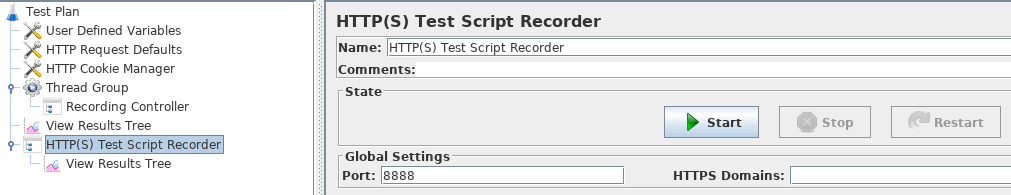 - Return to HTTP(S) Test Script Recorder, and click the Start button at the top.