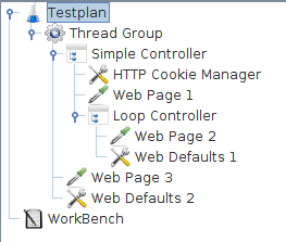 The JMeter test tree contains elements that are both hierarchical and ordered. Some elements in the test trees are strictly hierarchical (Listeners, Config Elements, Post-Processors, Pre-Processors, Assertions, Timers), and some are primarily ordered (controllers, samplers). When you create your test plan, you will create an ordered list of sample request (via Samplers) that represent a set of steps to be executed. These requests are often organized within controllers that are also ordered. Given the following test tree: