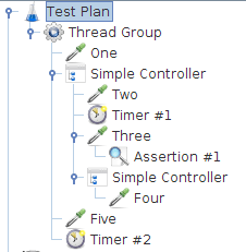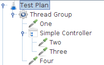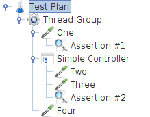 The order of requests will be, One, Two, Three, Four. Some controllers affect the order of their subelements, and you can read about these specific controllers in the component reference. Other elements are hierarchical. An Assertion, for instance, is hierarchical in the test tree.